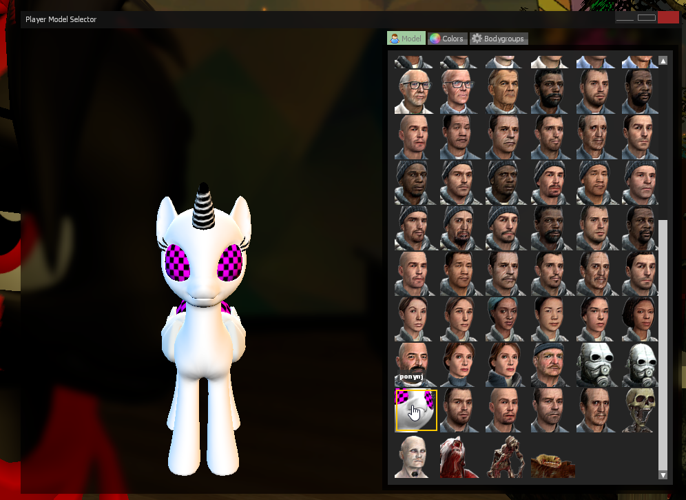 • Scroll down and you will find a white pony with the no texture pink eyes, click on it.